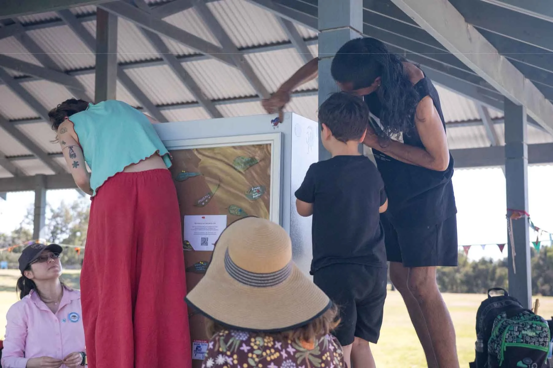 Like all good community projects, this community hub is the result of many people coming together. Notably, the Jarrah components were custom built by the local Cockburn Community Mens Shed, the library box was sponsored by the locally-owned engineering company Resolve Automation, and the whole thing was drilled in place by locally-owned Full Pressure Plumbing and Gas, ensuring that the hub will last a lifetime. The cherry on top was the smattering of artworks prepared by Paper and Palette students, and turned into long-lasting UV decals by local business Little Grey Cat Co. We’d also like to extend an extra-special thank you to our anonymous artist who found time to do this project last minute using their own supplies!